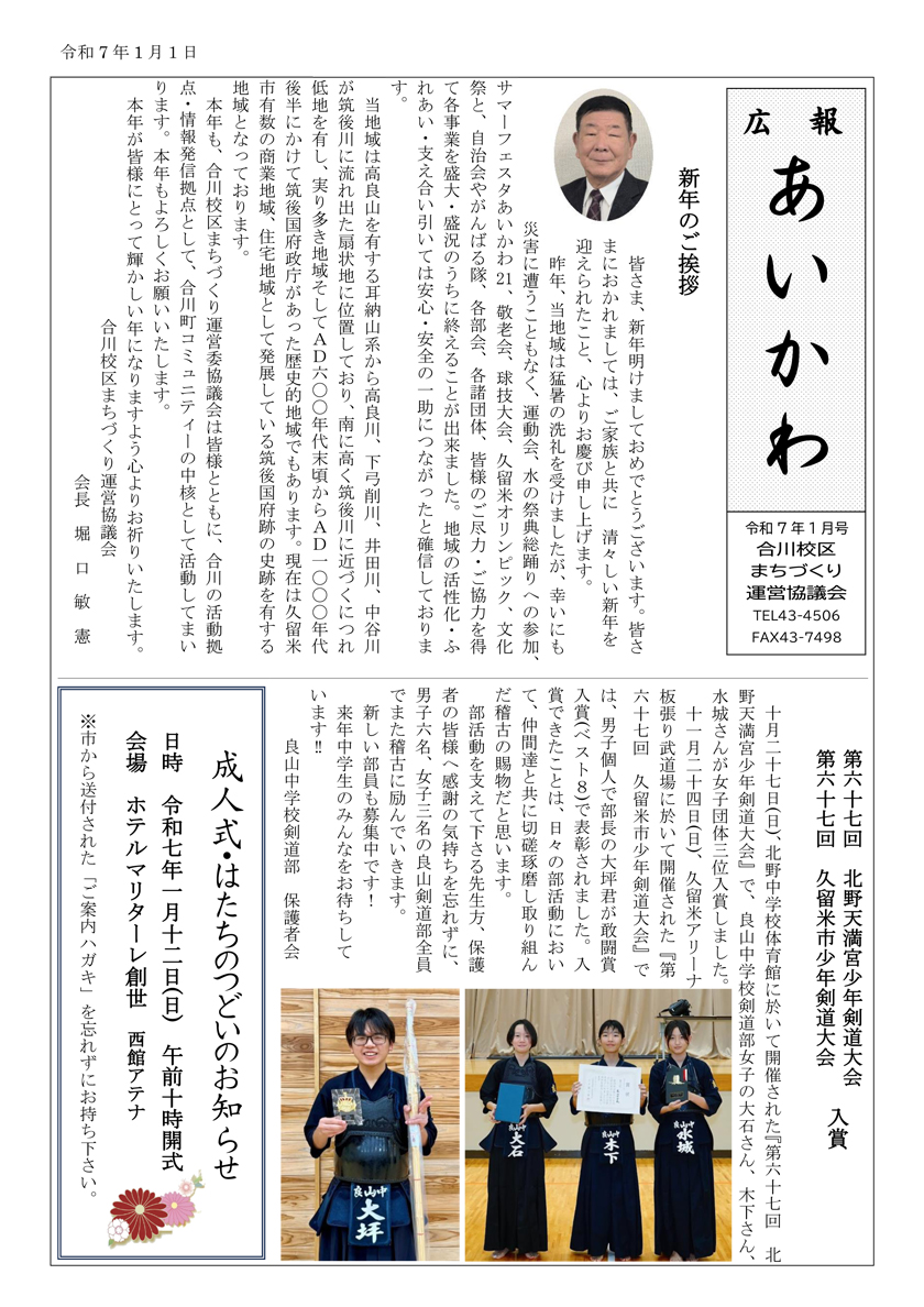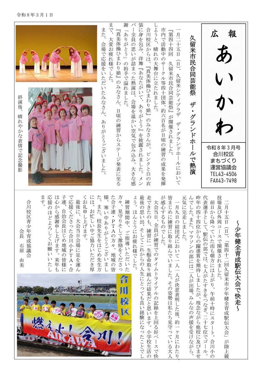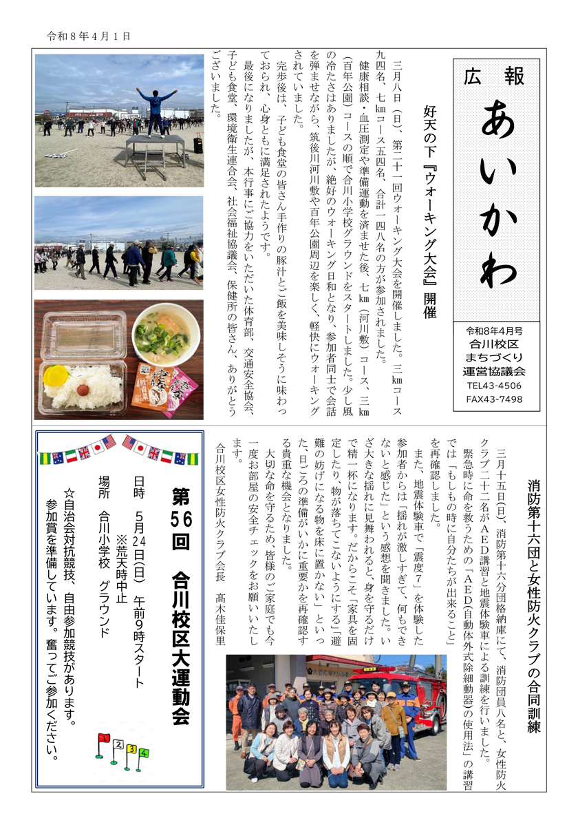 「広報あいかわ」では毎月、合川校区の情報を発信しています。 ※画像をクリックすると拡大し、カーソルを左右に合わせるとページをめくる事ができます。